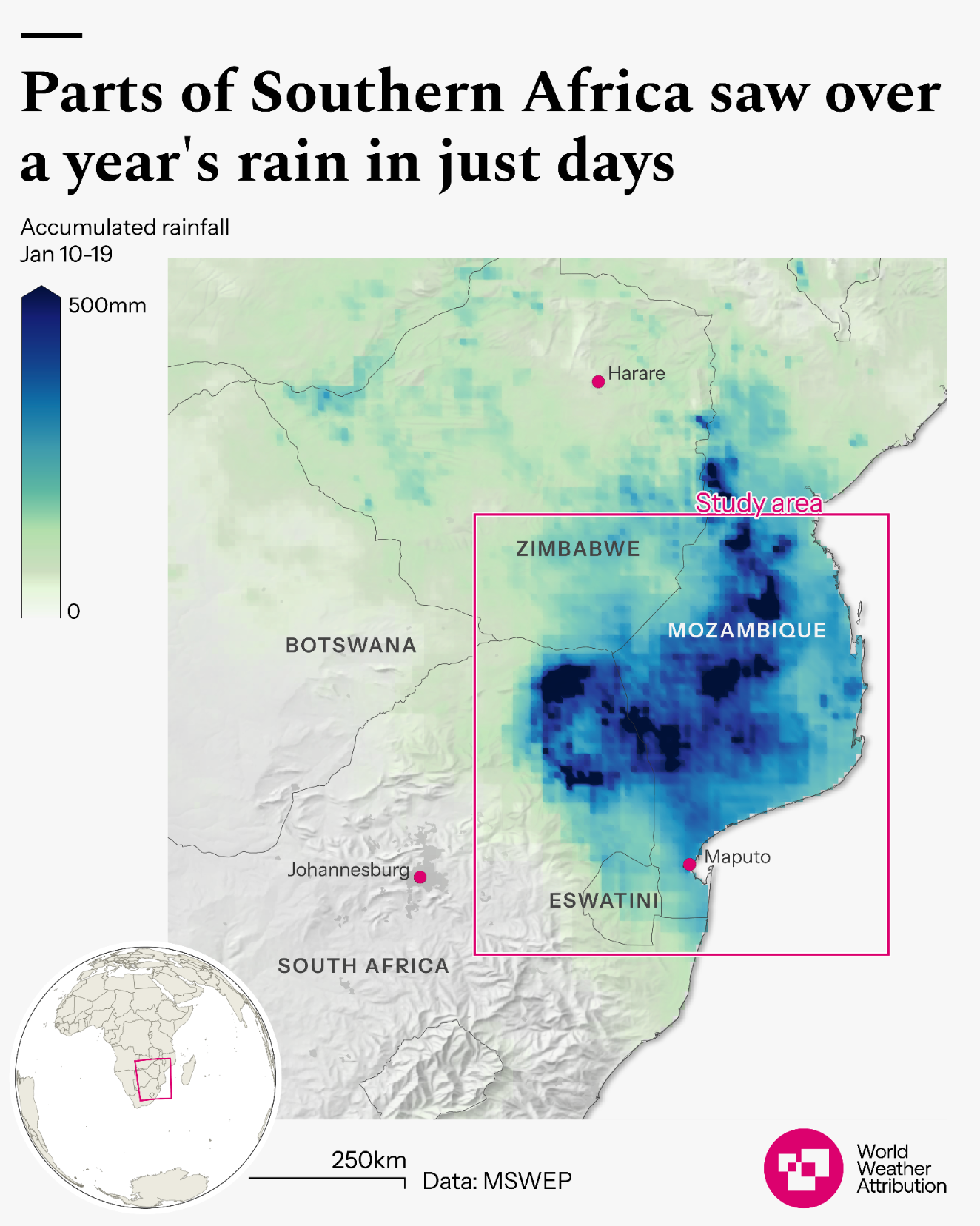 The countries most affected by the floods, and analysed by the study, are Eswatini, Mozambique, South Africa and Zimbabwe, with some areas receiving up to 200mm of rain, according to the study authors.