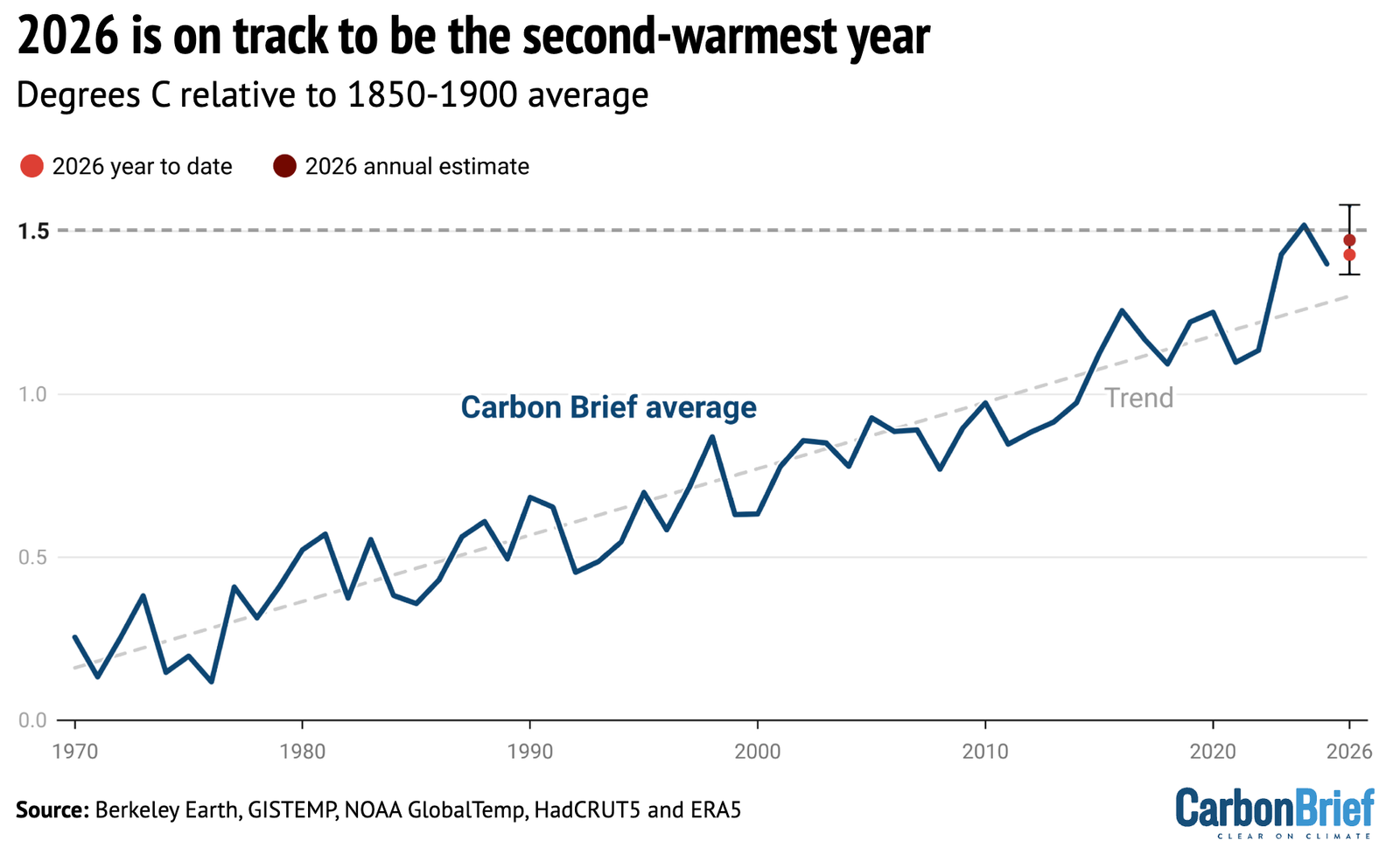 With a strong – or even “super” – El Niño event expected to develop later this year, Carbon Brief estimated that 2026 is on track to be the second-warmest year on record. The prediction puts global average temperature in 2026 at between 1.37C and 1.58C above pre-industrial levels, with a best estimate of 1.47C. This means that 2024 is “virtually certain” to be one of the top-four warmest years, but there is still a 19% chance that 2026 will be the warmest year on record – beating the prior record set in 2024.