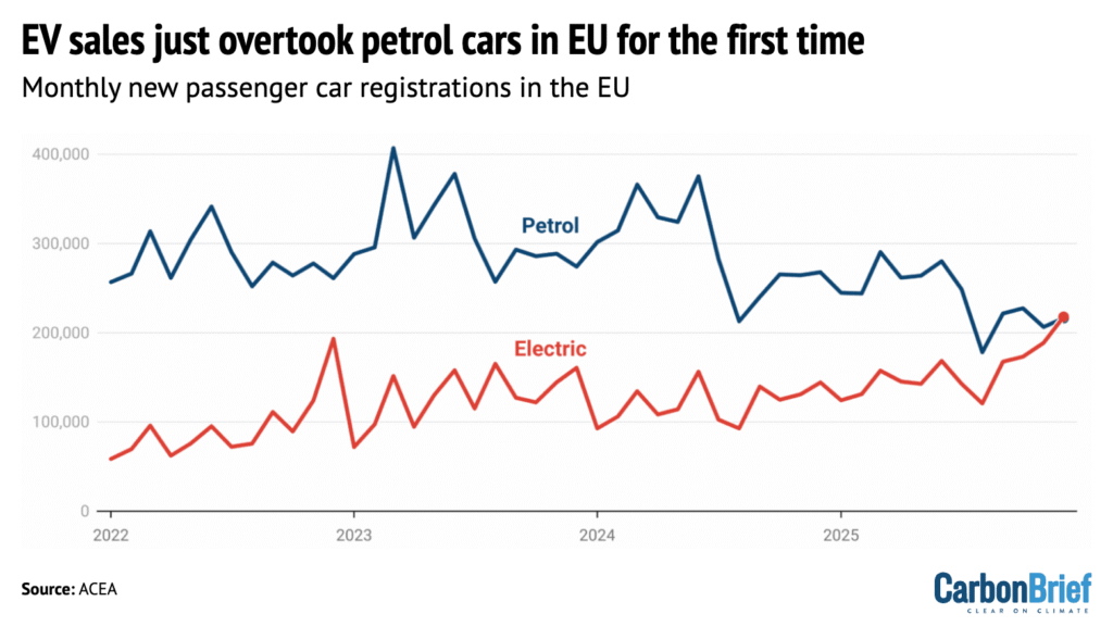 Sales of electric vehicles (EVs) overtook standard petrol cars in the EU for the first time in December 2025, according to new figures released by the European Automobile Manufacturers’ Association (ACEA) and covered by Carbon Brief. Registrations of “pure” battery EVs reached 217,898 – up 51% year-on-year from December 2024. Meanwhile, sales of standard petrol cars in the bloc fell 19% year-on-year, from 267,834 in December 2024 to 216,492 in December 2025, according to the analysis.