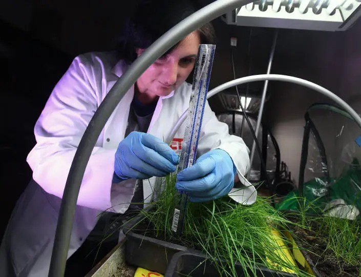 A woman in laboratory clothing in a darkened space, works at a surface where plants and circular metal struts are visible
